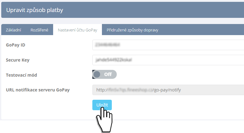 Nyní se vraťte zpátky do nastavení - způsoby platby a u nově vytvořené online platby zvolte editace. Pokračujte na záložku Nastavení účtu GoPay (popř. PayU). Zde vyplníte testovací údaje, které vám poskytl provozovatel platební brány:
